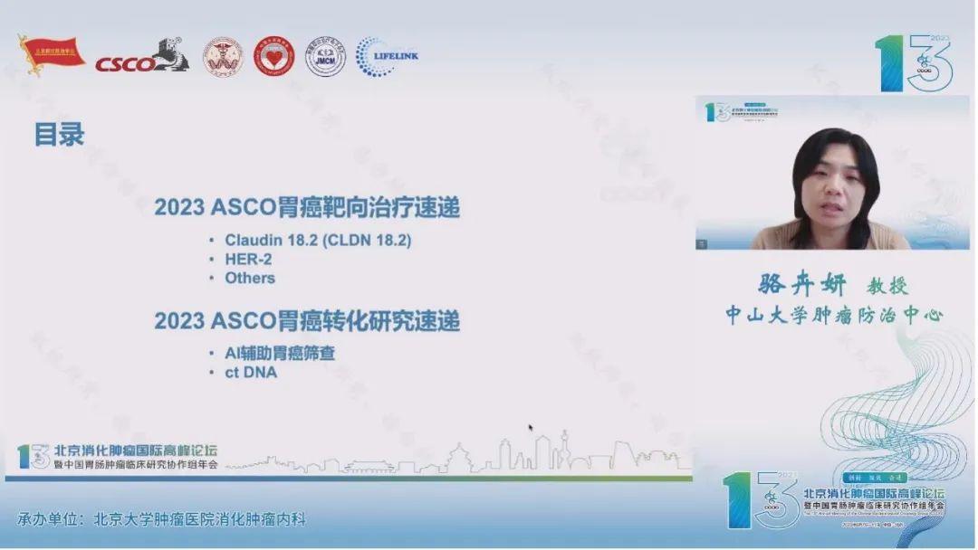 随后,来自中山大学肿瘤防治中心的骆卉妍教授带来了2023年ASCO胃癌靶向及转化研究治疗相关内容。今年胃癌的靶向研究仍重点聚焦Claudin18.2和HER2,随着SPOTLIGHT、GLOW研究阳性结果的公布,晚期胃癌的靶向治疗有了新的突破,针对经典靶点研发的多种新型药物分子在I期临床上得到了安全性验证,更多靶点如ATR、FGFR等的探索也在如火如荼的进行。AI模型胃癌筛查、ctDNA疗效预测报告了初步结果,积极推动转化研究的开展,对胃癌精准化治疗有着重要意义。